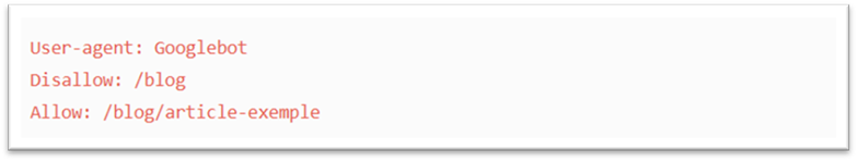 La directive Allow fonctionne à l’inverse de Disallow. Elle permet à un moteur de recherche d’explorer une page ou un sous-dossier précis même si le répertoire principal est bloqué.