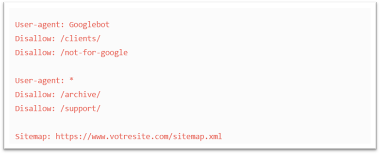 📌 Important : Les robots lisent le fichier de haut en bas et appliquent le premier groupe de règles le plus spécifique.